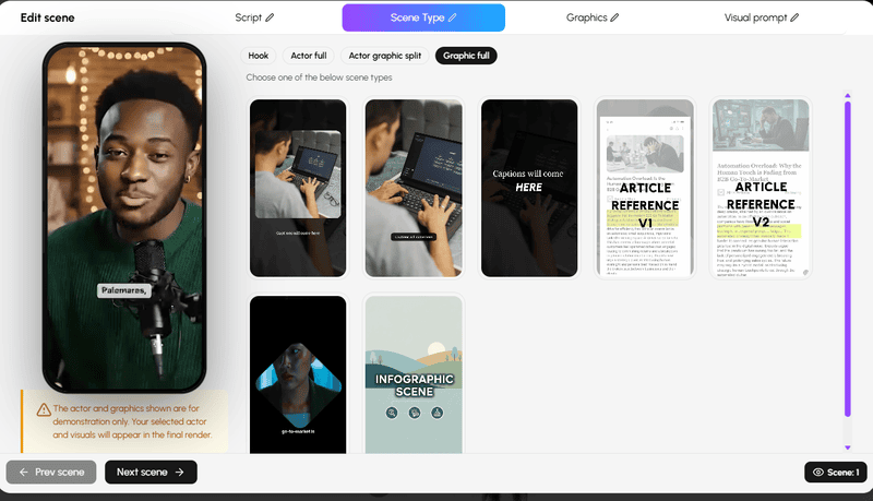 When reviewing your storyboard, look for scenes where the message should feel personal, grounded, or authoritative. If a scene feels visually busy or over-designed, switching it to Actor Full Screen can sharpen focus and strengthen connection. This format works best when delivery is concise and expressive, with enough energy to hold attention on its own.